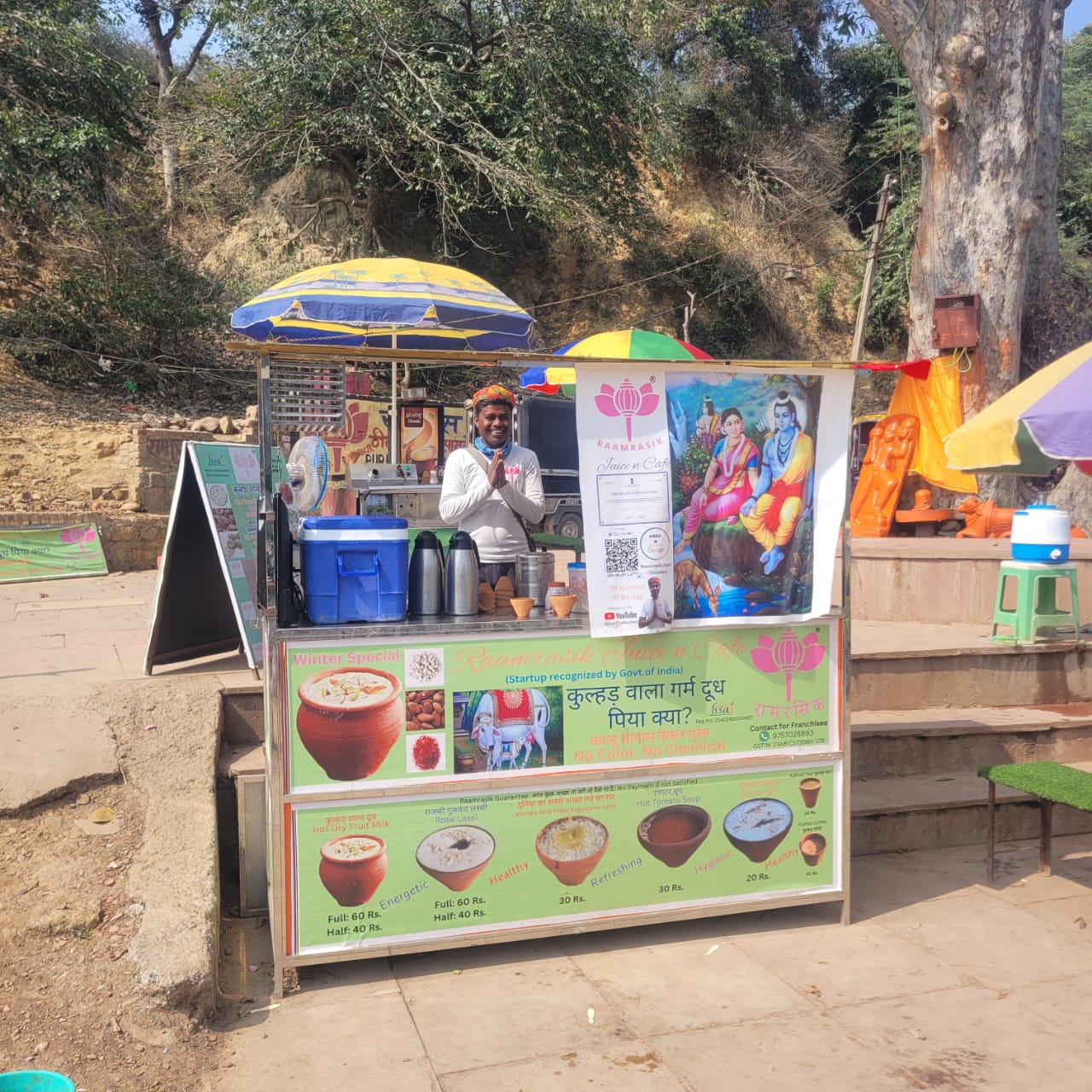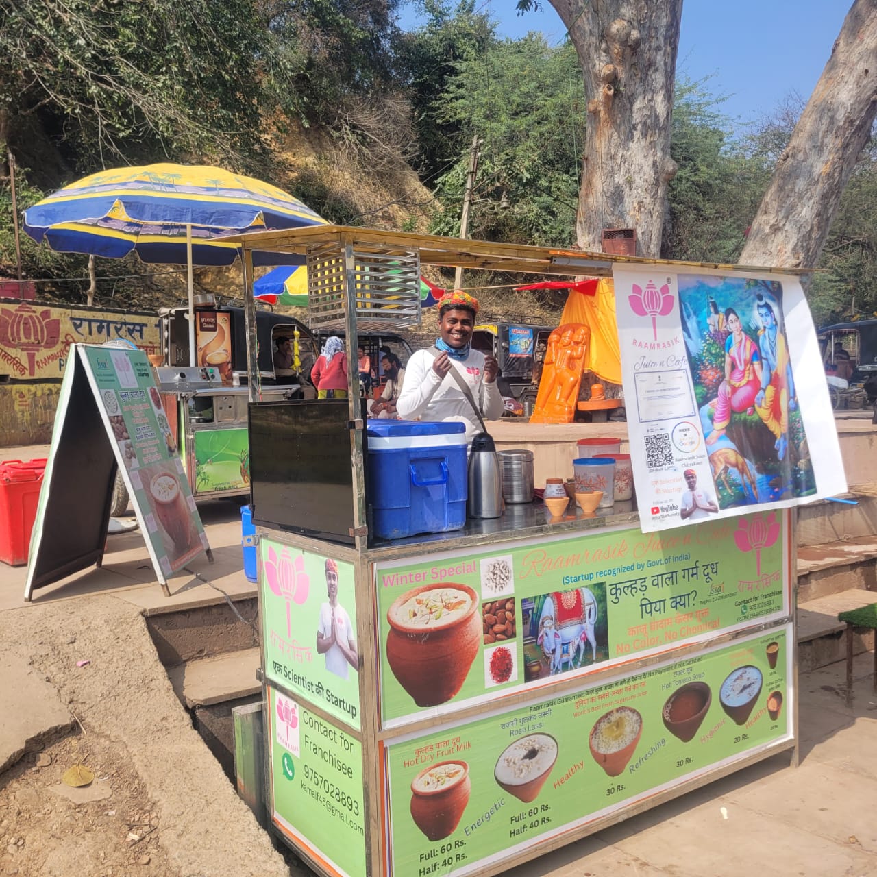 Raamrasik is operating its first outlet in Sfatik Shila, Chitrakoot serving hygienic, fresh and natural drinks like Cane Juice, Lassi, Buttermilk, Dry-Fruit Milk, etc. Focusing on the 3 Ps viz. Product (Natural and Healthy), Packaging (No single-use plastic policy by serving in Kulhars), and Payment (Customer pays only after Satisfaction), Raamrasik provides a rich experience to the customer with the Ramayan-themed ambience and staff-behavior.